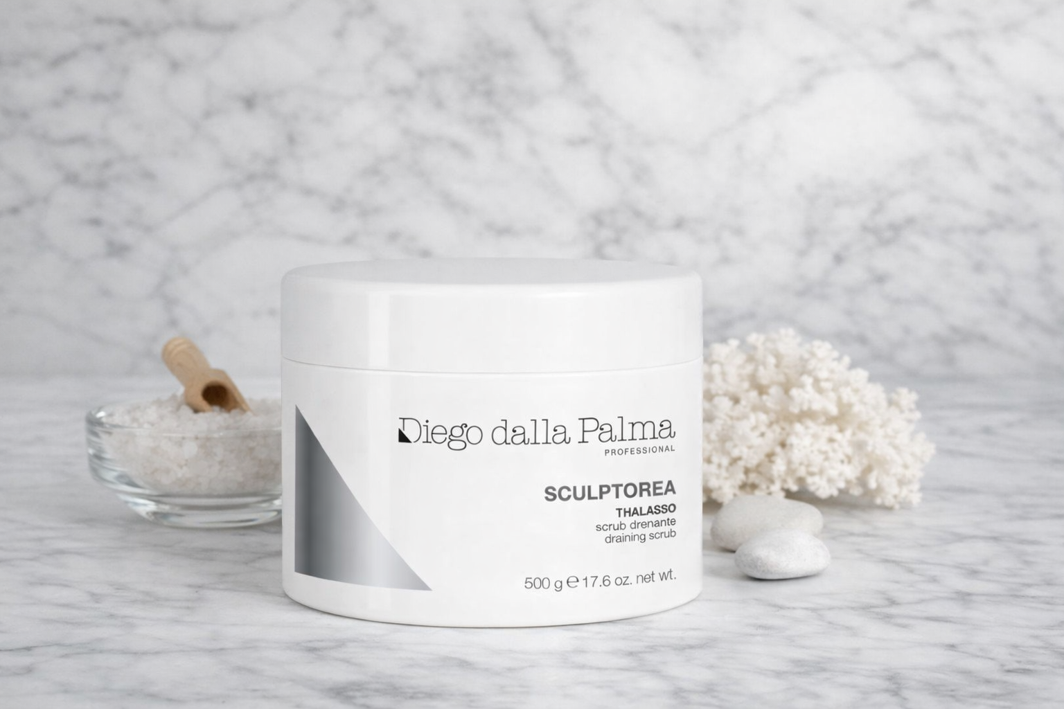 Diego dalla Palma Sculptorea Thalasso Scrub łączy mechaniczne złuszczanie z działaniem drenującym, charakterystycznym dla preparatów thalassoterapii. Ziarna soli morskiej i cukru fizycznie usuwają martwe komórki naskórka, wygładzając powierzchnię skóry i przywracając jej jednolitą teksturę. Masaż kolistymi ruchami podczas aplikacji stymuluje przepływ krwi w naczyniach włosowatych, co wspiera naturalne procesy detoksykacyjne tkanek.